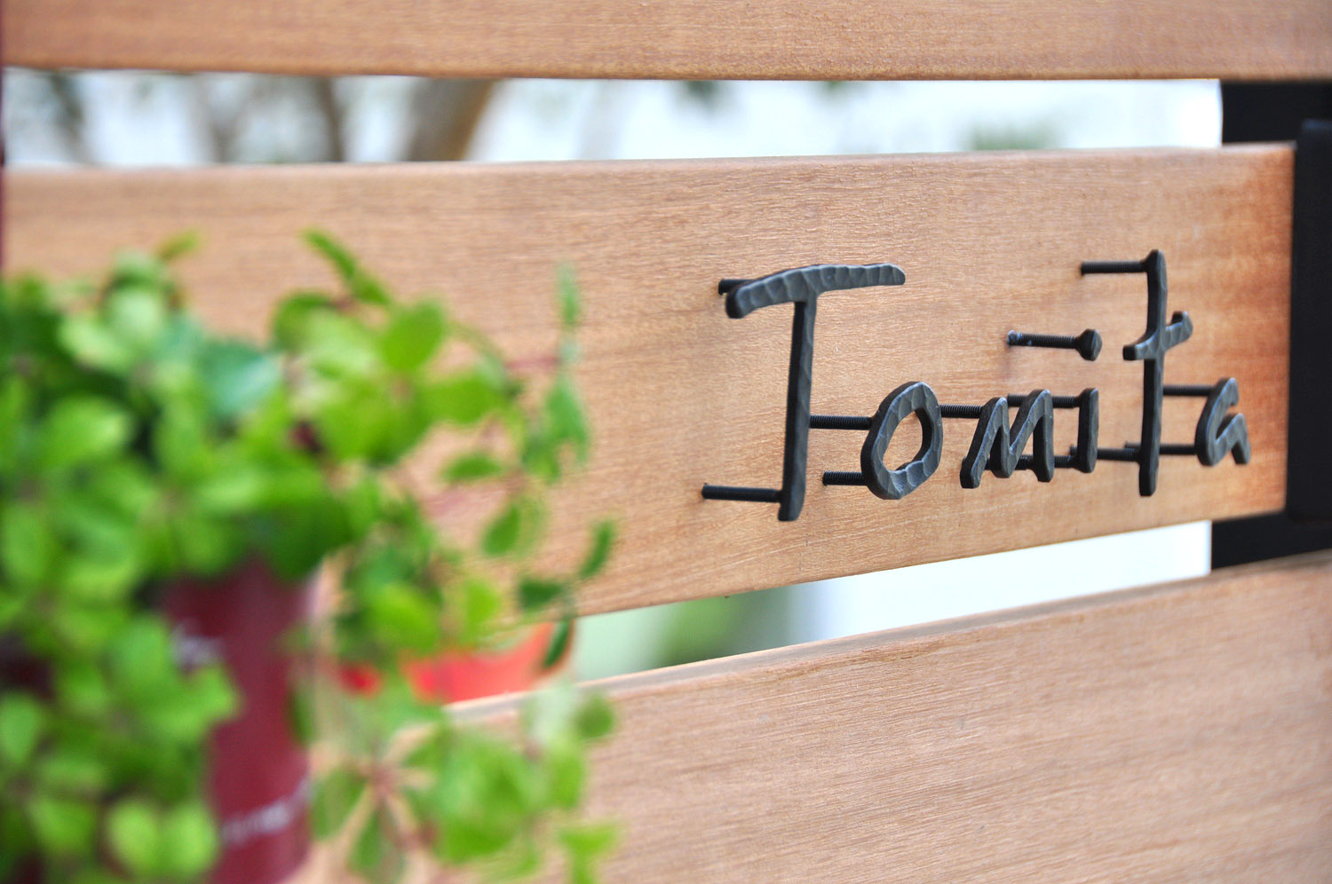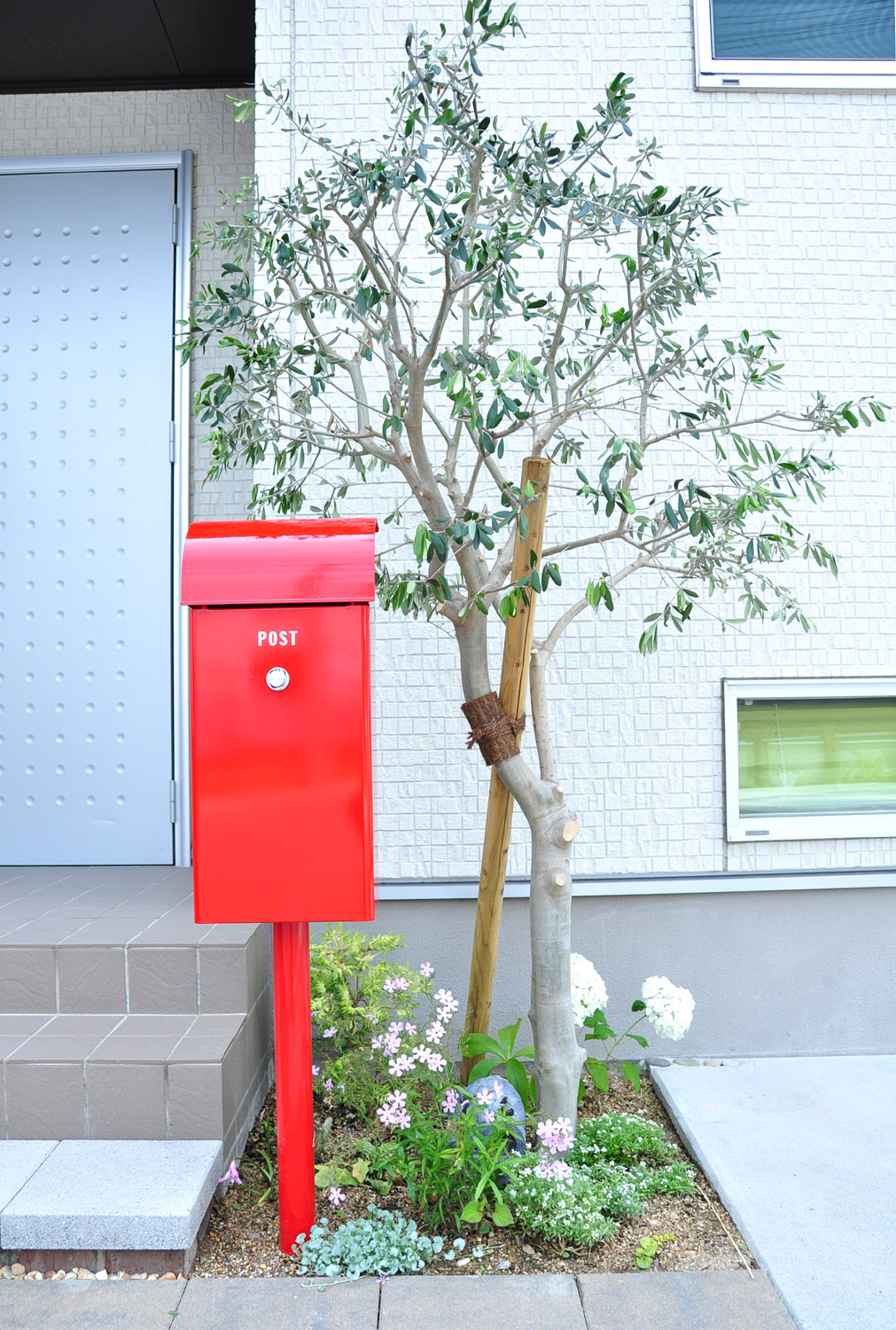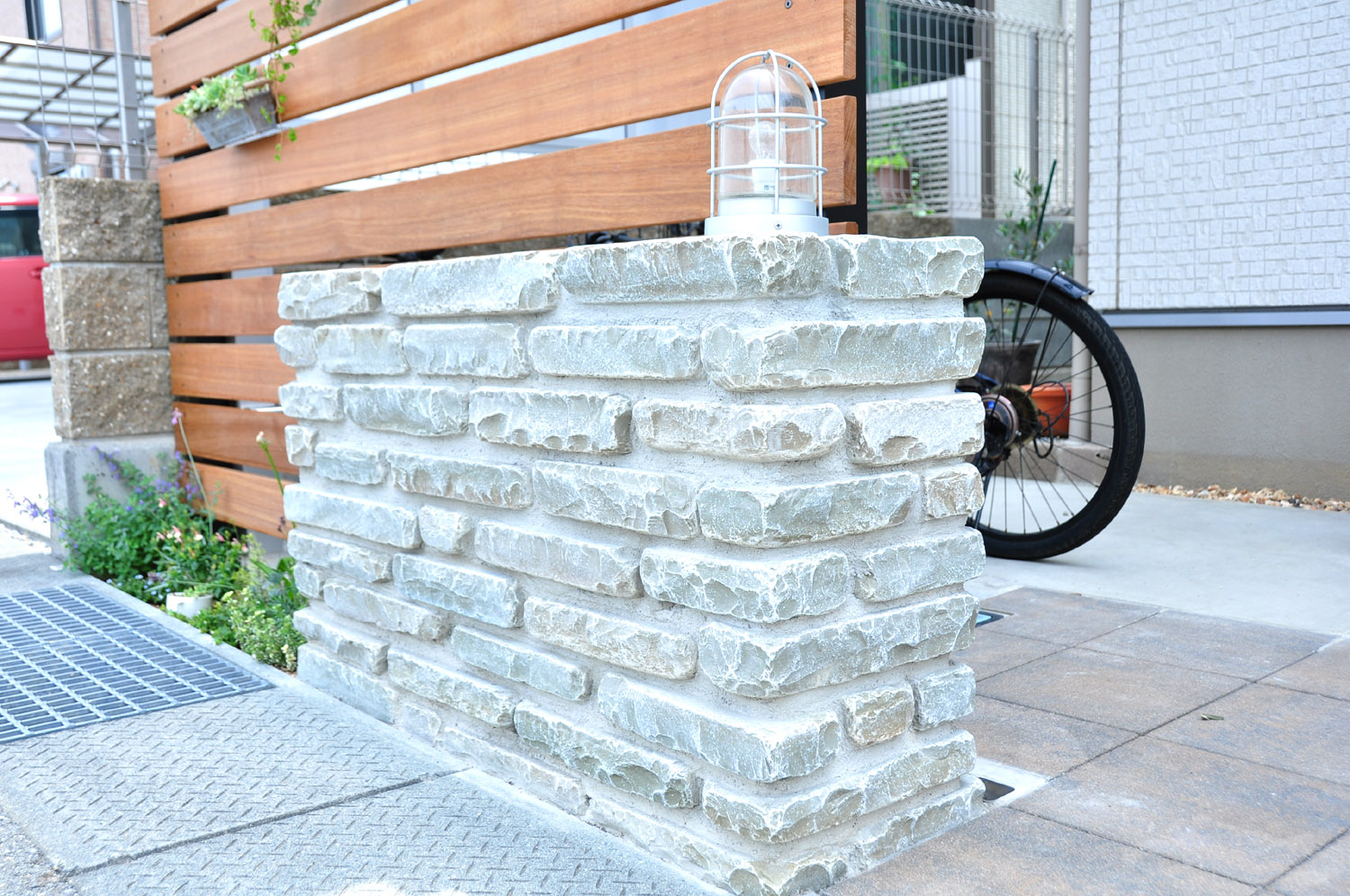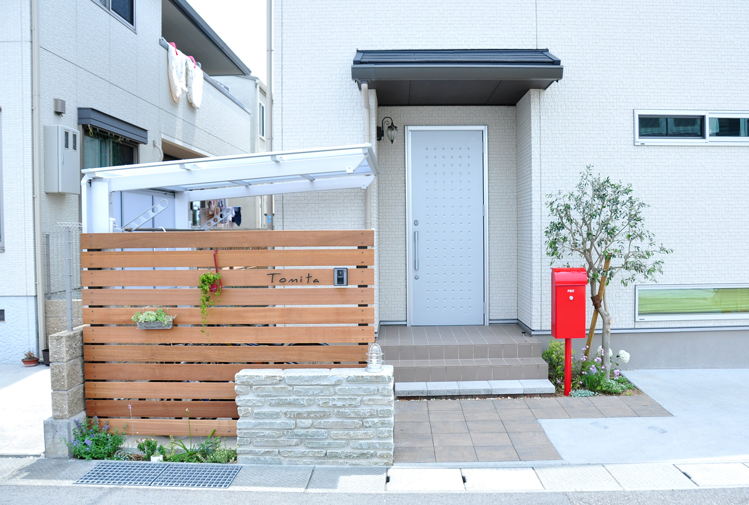 ●木製フェンスと石積みで大きな門柱を作り、目隠しに。玄関右側にも植木とポストを配置して、ナチュラルでかわいい門まわりをご提案しました