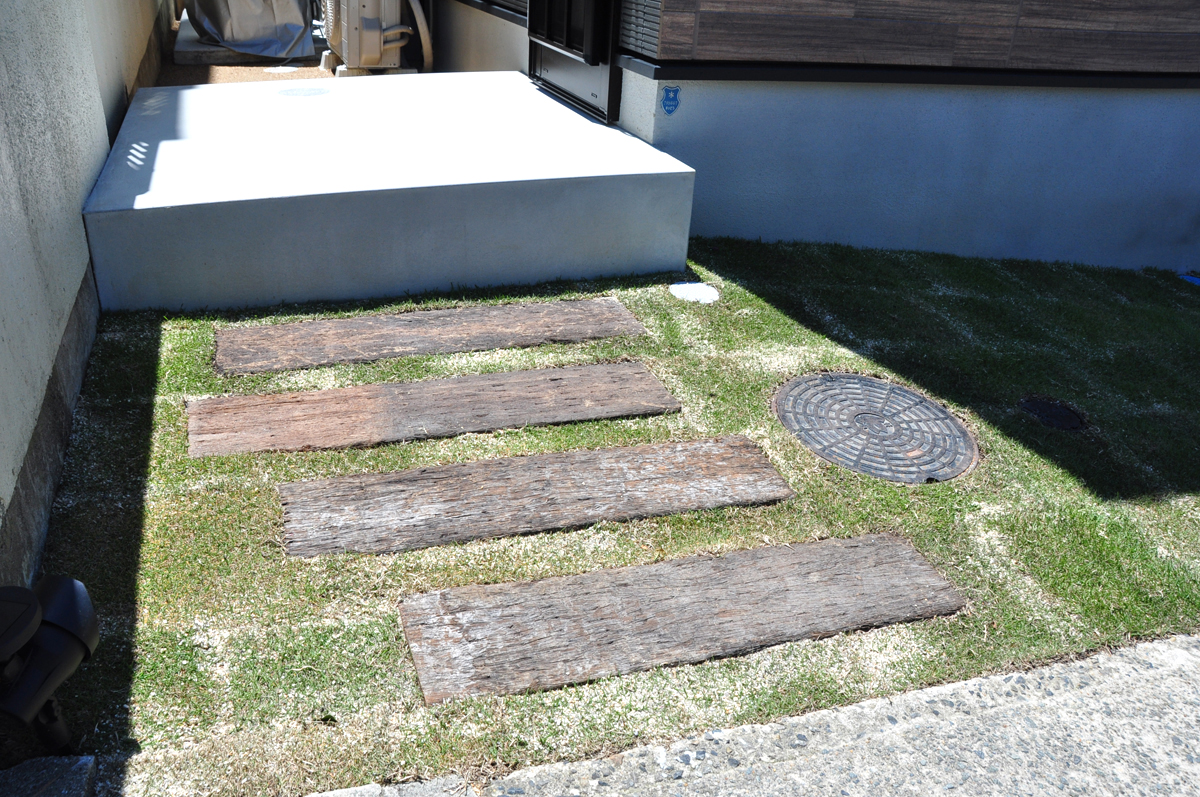 コンクリートの白と芝生の緑のコントラストで、あたたかいけどシンプルな外構が出来ました。
