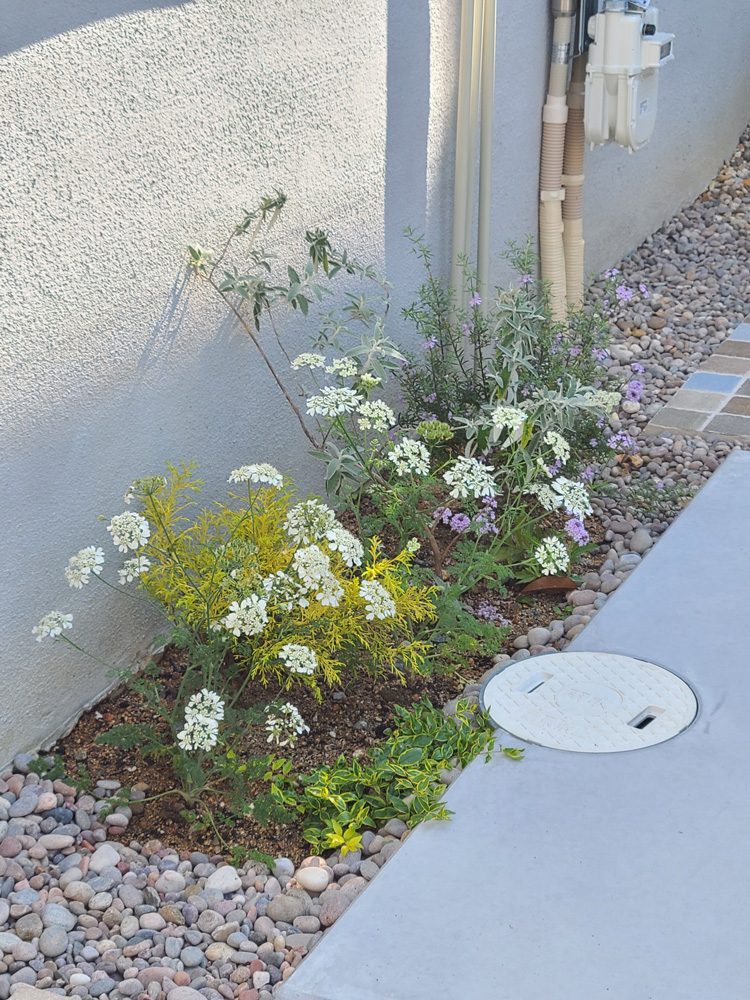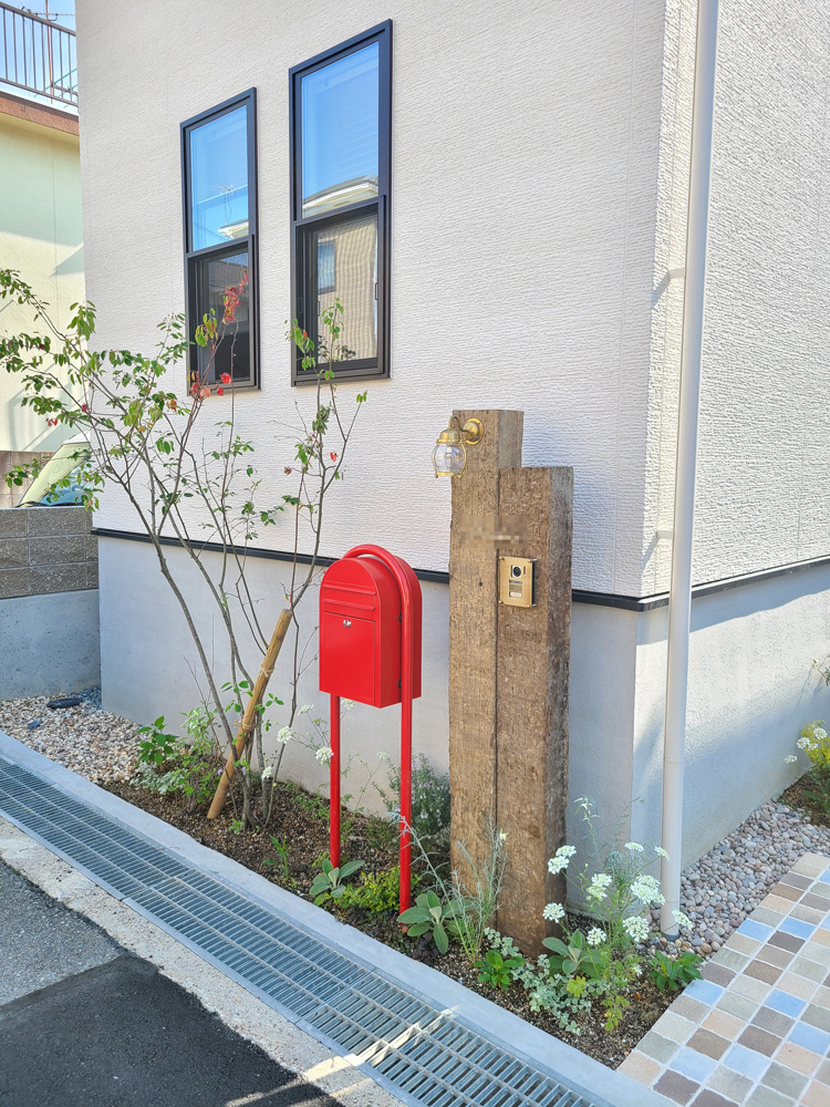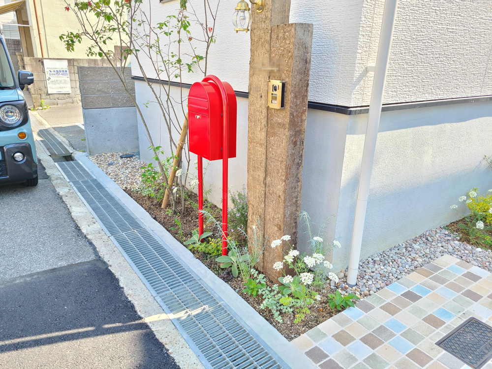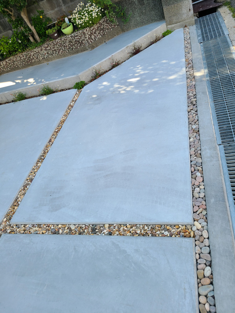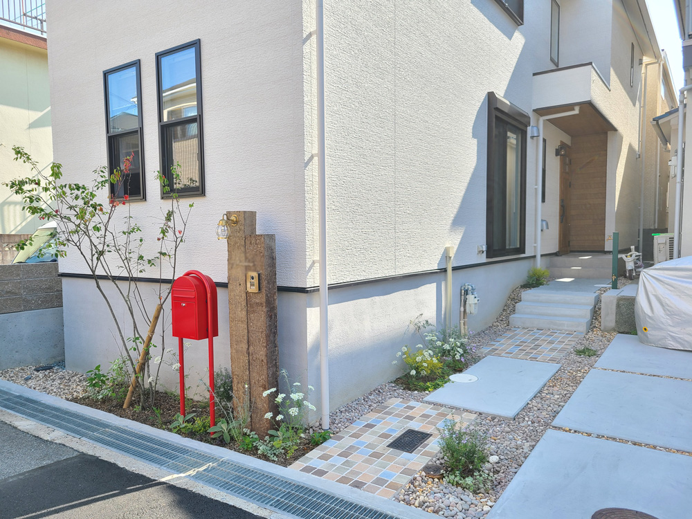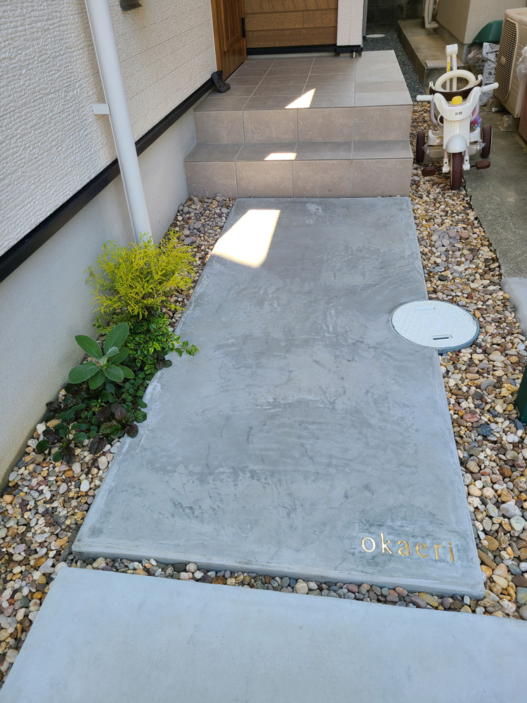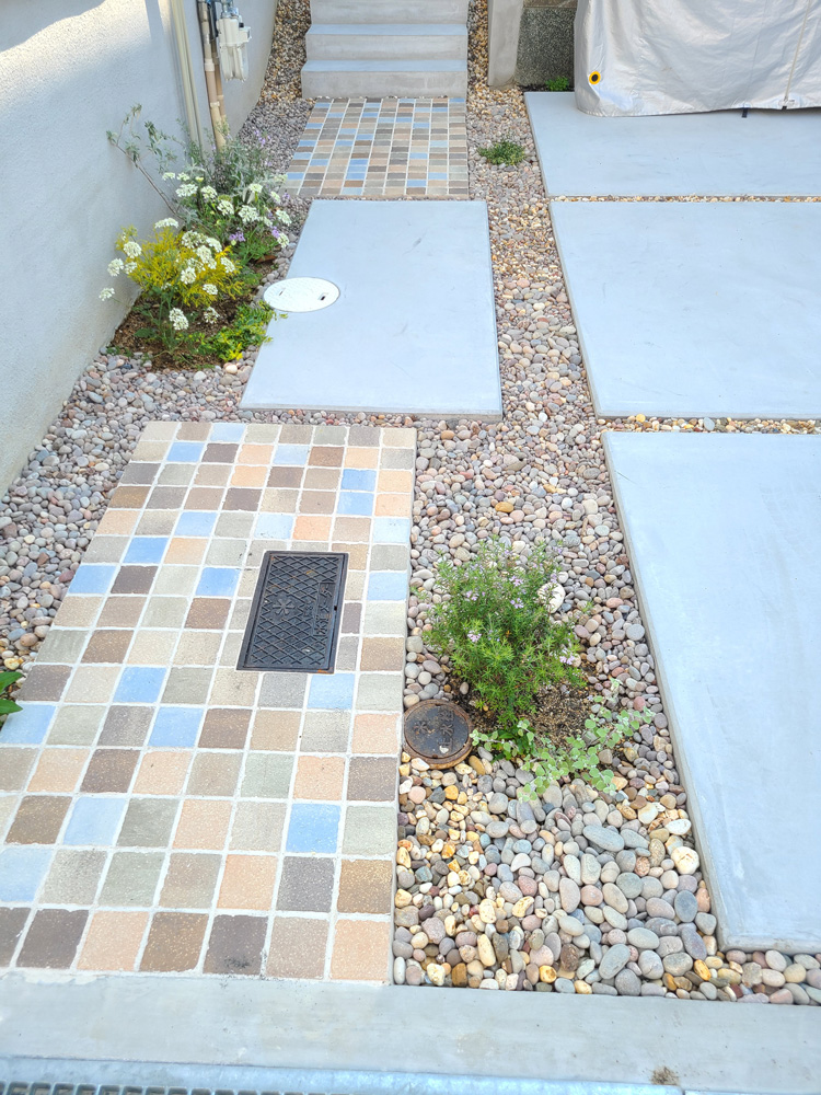 細長いアプローチは、タイルとモルタルで小道の作りました。お玄関まで楽しく歩いていける